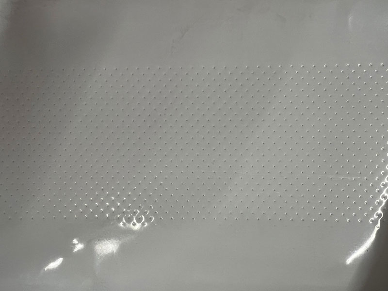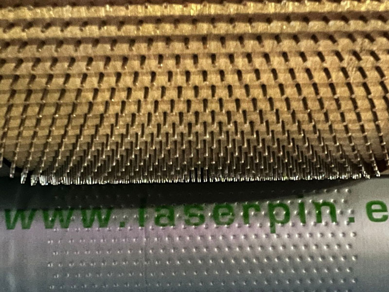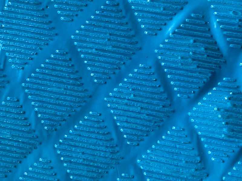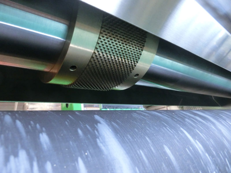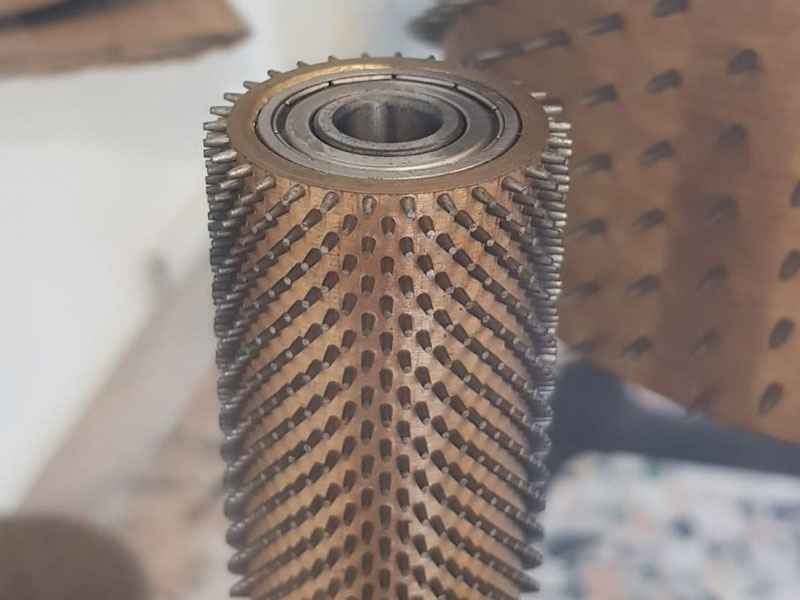 The drilling process is activated by pneumatic cylinders that move the support roller in contact with the drill shaft. An integrated penetration adjustment system adjusts the depth with which the needles penetrate the material, allowing the level of embossing penetration to be controlled. Different densities are available according to various needs and applications. The EM100 guarantees an excellent result even at low densities. The main applications of embossing involve non-slip systems for bags, to increase grip, and to engrave custom logos and imprints (embossed designs).