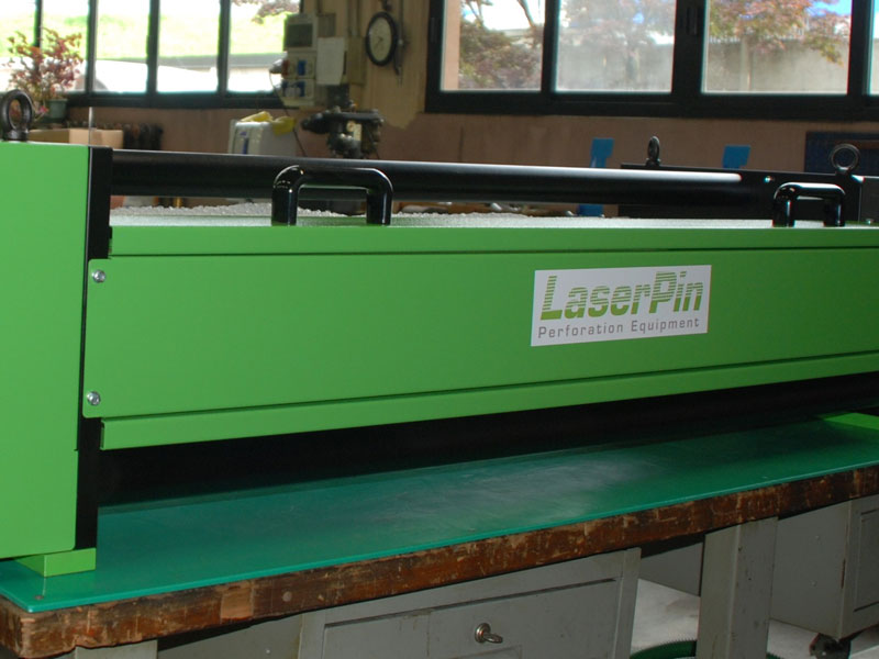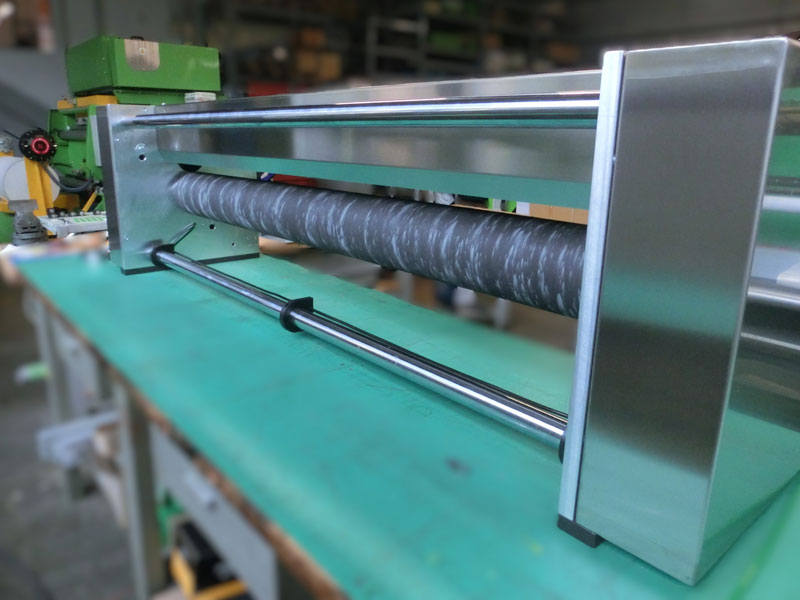 It consists of a perforating assembly composed of a shaft on which the embossing cylinders are mounted and a rubber contrast roller. The latter brings the moving material into contact with the needle shaft. The drive system consists of a driver, servo motor and encoder, making it possible to synchronize the speed of rotation of the shaft to that of the material up to a maximum speed of 300 meters per minute, thus perfectly capable of supporting all the speeds on the market.